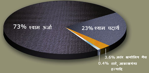खगोल वैज्ञानिको के अनुसार ब्रह्माण्ड का कूल 74% से 76% भाग श्याम ऊर्जा से बना है, 20% से 22% भाग श्याम पदार्थ से तथा शेष 4 % साधारण पदार्थ से बना है। इस शेष 4% मे हम, हमारा सौरमंडल तथा हमारी आकाशगंगा शामिल है। ब्रह्माण्ड मे कितने नगण्य और तुच्छ है हम !
