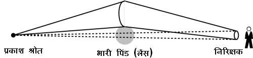 एक तारा हर दिशा मे प्रकाश उत्सर्जित करता है लेकिन हम उस प्रकाश का एक छोटा सा भाग ही देख पाते है जो हमारी दिशा मे होता है। यदि कोई भारी पिंड हमारे और उस तारे के मध्य मे से गुजरता है तब उस भारी पिंड का गुरुत्व तारे की उन प्रकाश किरणो को हमारी ओर मोड़ देता है जो हमारी दिशा मे नही थी। इस कारण हम ज्यादा प्रकाश देख पाते है, तारा ज्यादा चमकिला प्रतित होता है। इसे ही गुरुत्विय लेंस कहते है। अंतरिक्ष मे गुजरता हुआ कोई भारी पिंड जब किसी तारे और हमारे मध्य से आता है तारा ज्यादा चमकिला दिखता है, जब यह पिंड तारे के सामने से गुजर जाता है, तारा धूंधला हो जाता है। किसी तारे के प्रकाश मे आने वाले इस परिवर्तन का पूर्वानुमान आइंस्टाइन के सापेक्षतावाद के समीकरणो ने किया था, इन समीकरणों से उस भारी पिंड के द्रव्यमान की गणना की जा सकती है।