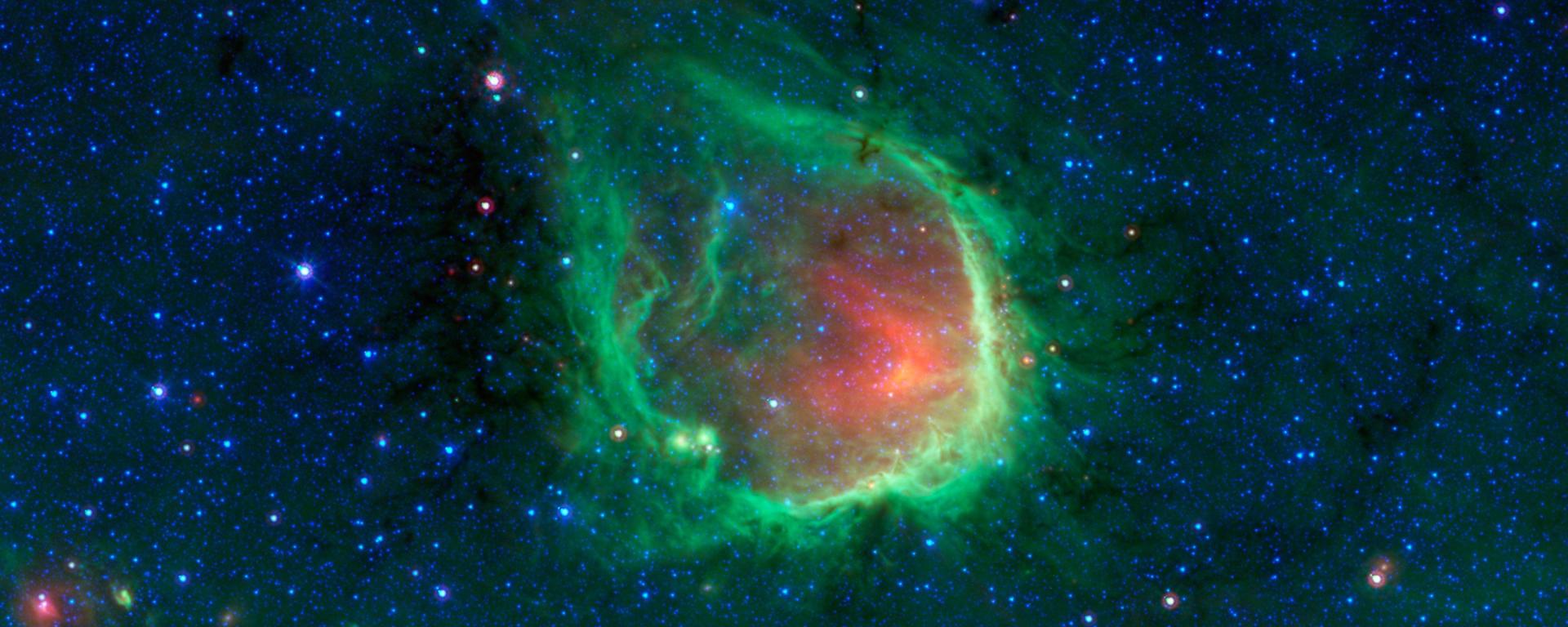 यह RCW 120 नामक कई प्रकाशवर्ष चौड़ा , पृथ्वी से 4300 प्रकाशवर्ष दूर गैस का महाकाय बुलबुला है। यह चित्र स्पिट्जर अंतरिक्ष वेधशाला से लिया गया है। इस चित्र मे गैस की चमक अत्याधिक शीतल भाग को दर्शा रही है जिसका तापमान शून्य से कई सौ गुणा निचे है। यह एक कृत्रिम रंग(False Color Image) का चित्र है क्योंकि स्पिटजर अवरक्त किरणो से भी कम तरगंदैधर्य के चित्र ले सकता है जिसमे इस के जैसे पिंड भी चमकते है।