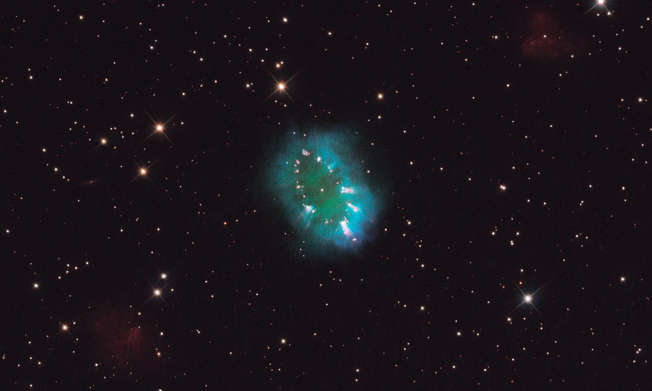 हब्बल द्वारा लीया गया यह चित्र एक ग्रहीय निहारिका का है, जो किसी मृत तारे द्वारा एक महाविस्फोट से निर्मीत है। इस निहारिका के केन्द्र मे दो तारे एक दूसरे की परिक्रमा कर रहें है। इन मे से एक तारा का आकार उसकी मृत्यु के समय बड़ता गया, औअर वह इतना फूल गया कि दूसरा तारा उसके द्वारा लगभग निगला जा चुका था। इस प्रक्रिया मे दोनो तारो का गुरुत्विय संतुलन बिगड़ गया और बड़े तारे के अभिकेन्द्र बल(Centripetal Force) के कारण उसका सारा पदार्थ कई प्रकाश वर्ष चौड़ी तश्तरी(Disk) के रूप मे फैल गया। इसके पश्चात जब मृत होते हुये तारे मे विस्फोट हुआ उस तारे की बाह्य परतो के अलग हो जाने से गर्म आंतरिक केन्द्र सामने आ गया। इस आंतरिक केन्द्र के प्रकट होने से पराबैंगनी किरणो द्वारा गैस गर्म होने लगी और यह निहारिका एक नियान साइन के जैसे जगमगाने लगी।