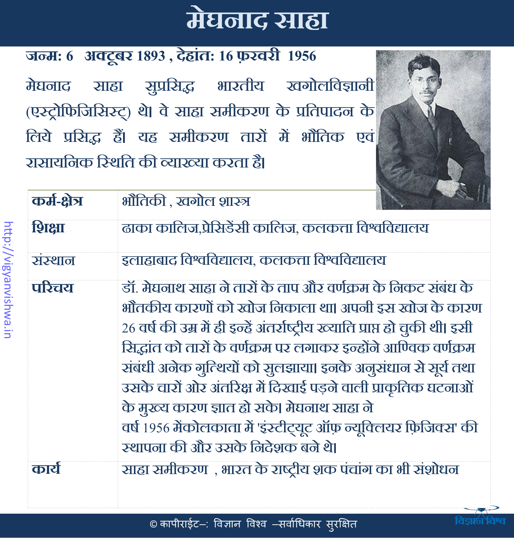 - मेघनाद साहा का सबसे बडा योगदान खगोलविज्ञान के क्षेत्र में रहा है। उनका साहा समीकरण विश्व प्रसिद्ध है। यह समीकरण तारो में भौतिक और रासायनिक स्थिति की व्याख्या करता है।