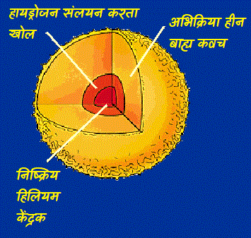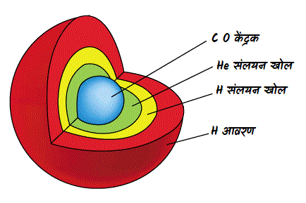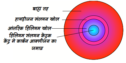 हम इसे सरलतम रूप मे समझने का प्रयास करेंगे। जब कोई तारा समाप्ति बिंदु पर पहुंचता है तब केंद्रक मे कोई नाभिकिय प्रक्रिया नही हो रही होती है। अब वह हिलियम केंद्र के चारो ओर मोटे खोल मे हायड्रोजन के संलयन से हिलियम बनाना आरंभ करता है। यह प्रक्रिया नीचे चित्र मे दिखाई गई है।