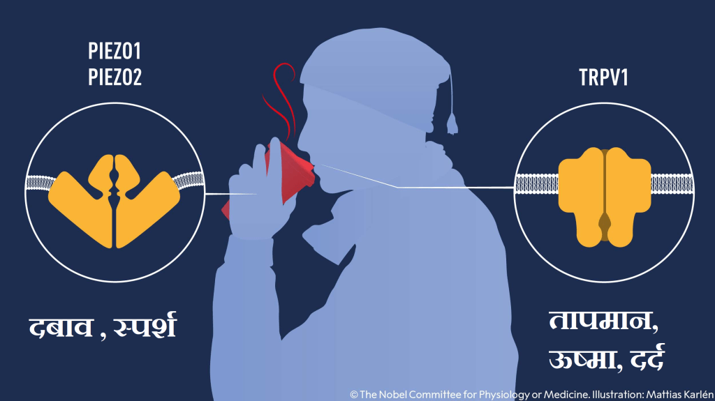 इस वर्ष का चिकित्सा नोबेल TRPV1,TRPM8 तथा Piezo आयन चैनल की क्रांतिकारी खोज को समर्पित है, यह खोज दर्शाती है कि हम किस तरह से ऊष्मा, शीत और स्पर्श महसूस करने के द्वारा हमारे आसपास के वातावरण को समझते है और उसके साथ समायोजित होते है। TRP चैनल हमारी ऊष्मा संवेदना के लिए महत्वपूर्ण है जबकी Piezo चैनल स्पर्श और हमारे अंगों की स्तिथि जानने और उनके संचालन के लिए महत्वपूर्ण है। इन चैनलों के ऊष्मा और दबाव पर निर्भर कुछ अन्य चयापचय संबधित कार्य भी है।