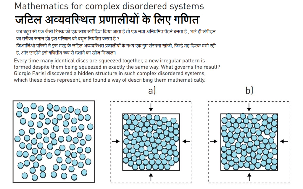 इस पुरस्कार का दूसरा भाग सेपीएंजा विश्वविद्यालय रोम इटली के जिओर्जिओ परीसी(Giorgio Parisi) को परमाणु से लेकर अंतरग्रहीय भौतिकी प्रणालियों में अव्यवस्था और विचलन की परस्पर क्रिया की खोज के लिए दिया गया है।