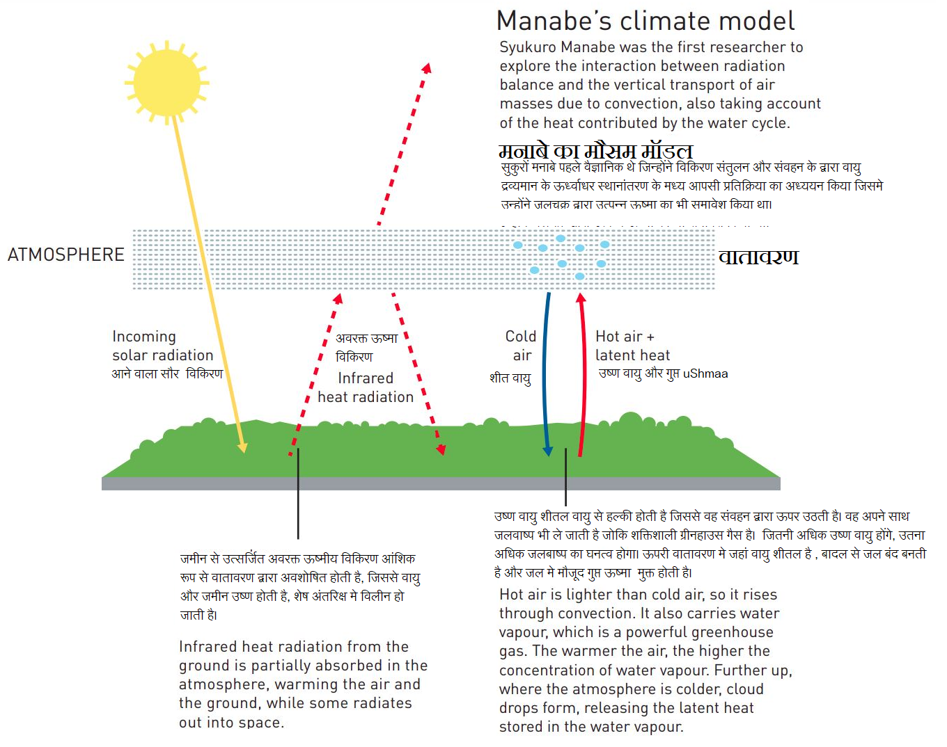 1950 के दशक मे जापानी भौतिक वैज्ञानिक सुकुरों मनाबे युद्ध की विभीषिका से प्रभावित जापान को छोड़कर अमरीका आए। उनका लक्ष्य अरहेनियस द्वारा 70 वर्ष पहले की गए अध्ययन के जैसे कार्बन डाई आकसाईड के अधिक स्तर द्वारा अधिक तापमान के संबंध को समझना था। अरहेनियस का मुख्य केंद्र विकिरण संतुलन था। मानबे ने 1960 के दशक मे इस माडल मे वायु द्रव्यमान का संवहन(convection)प्रक्रिया द्वारा ऊर्ध्वाधर स्थानातरण(vertical transport)और जलबाष्प की गुप्त ऊष्मा(latent heat) को भी जोड़ा।