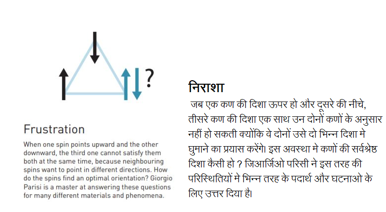 अपनी पुस्तक में परिसी ने लिखा है कि स्पिन ग्लास का अध्ययन शेक्सपियर के नाटकों मे मानवीय त्रासदी के अध्ययन के जैसा है। यदि आप दो व्यक्तियों से मित्रता करना चाहते है और वे दोनों एक दूसरे से नफरत करते हो तो आपके लिए यह एक निराशाजनक स्थिति होगी। एक गणितीय तरीका था जिसमे हर भाग की प्रतिकृति बनाई जाए। लेकिन यह तरीका गणित में ठीक से कार्य करता था लेकिन भौतिकी में कार्य नहीं करता था।