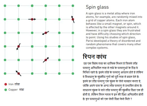 ये संघनित गेंदे साधारण कांच और दानेदार पदार्थ जैसे रेत का सबसे सरल माडेल है। लेकिन परिसी के वास्तविक अध्ययन का विषय एक दूसरे तरह का पदार्थ था, स्पिन कांच। यह एक विशेष तरह का धात्विक मिश्रण है जिसमे लौह परमाणु अनियमित तरह से तांबे के परमाणुओं के ग्रिड में मिश्रित रहते है। इसमे लोहे के परमाणु अत्यल्प होते है लेकिन वे मिश्रधातु के चुंबकीय गुणों को पूरी तरह से बदल देते है। इसमे हर लौह परमाणु एक चुंबक के जैसे व्यवहार करता है, जोकि अपने पास के अन्य लौह परमाणु से प्रभावित होता है। साधारण चुंबक मे सारे लौह परमाणु की चुंबकीय दिशा एक ही होती है, लेकिन स्पिन ग्लास मे इन की दिशा अनियमित होती है। इन परमाणुओं को एक जैसी दिशा कैसे मिले ?