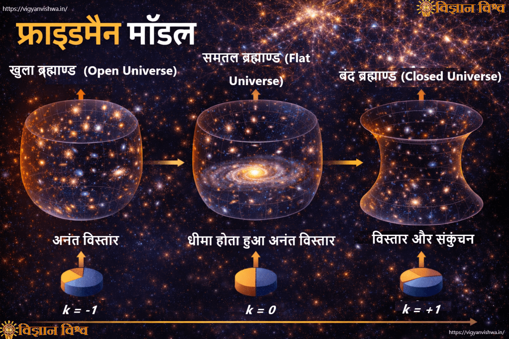 ब्रह्मांड की संभावित संरचना और उसका भविष्य समझने के लिए सामान्य सापेक्षतावाद (Albert Einstein) पर आधारित फ्राइडमैन मॉडल अत्यंत महत्वपूर्ण है। 1920 के दशक में Alexander Friedmann ने आइंस्टाइन के क्षेत्र समीकरणों से यह निष्कर्ष निकाला कि ब्रह्मांड स्थिर नहीं हो सकता; वह या तो फैल रहा होगा या सिकुड़ रहा होगा। फ्राइडमैन समीकरण ब्रह्मांड के विस्तार दर, पदार्थ घनत्व और वक्रता के बीच संबंध स्थापित करता है।
