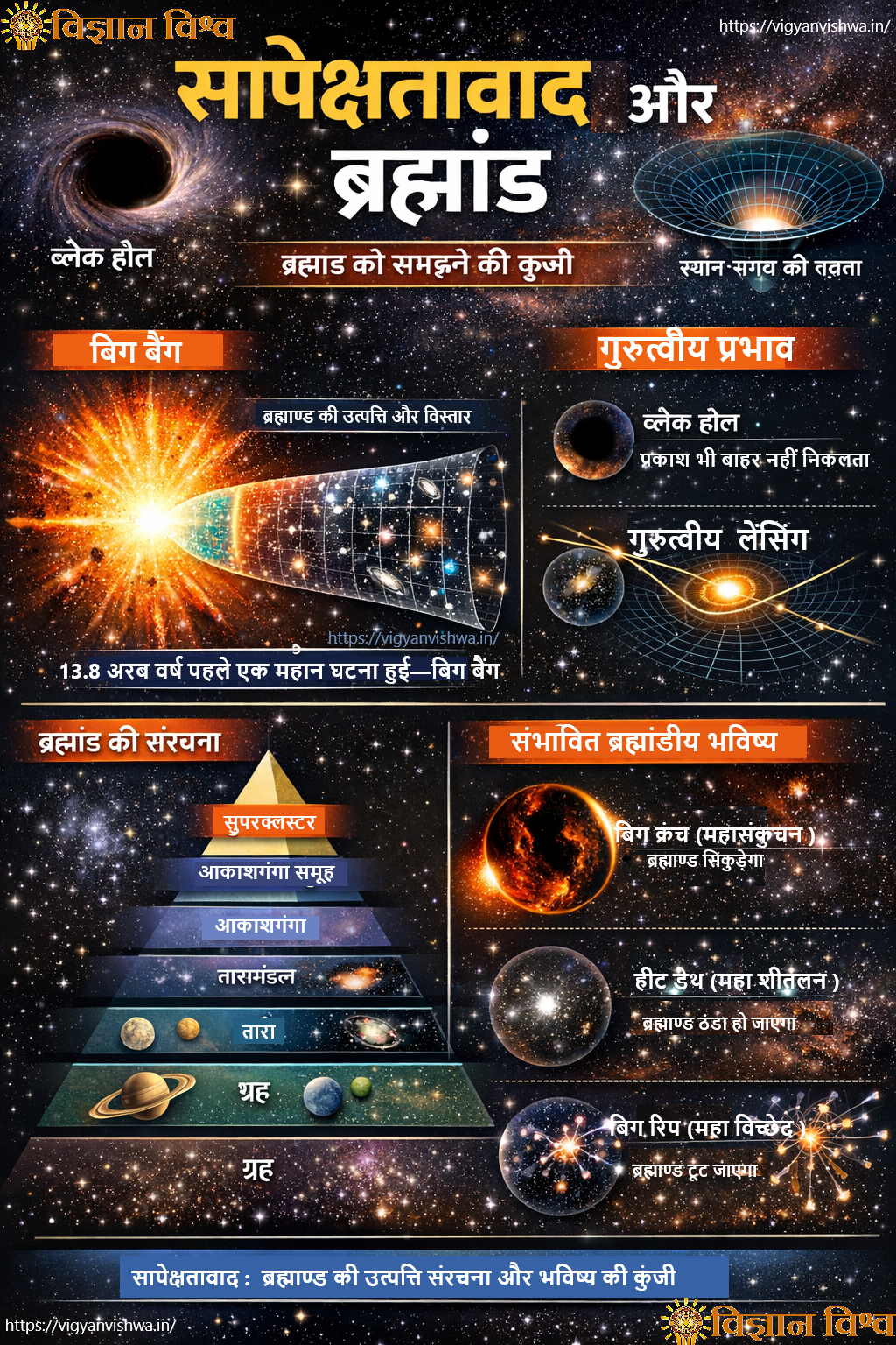 ब्रह्मांड ग्रहों, तारों, आकाशगंगाओं और सुपरक्लस्टर से मिलकर बना है, और इसका भविष्य इसके घनत्व और विस्तार की दर पर निर्भर करता है। इस प्रकार सापेक्षतावाद ब्रह्मांड की उत्पत्ति, संरचना और भविष्य को समझने का सबसे महत्वपूर्ण सिद्धांत है।