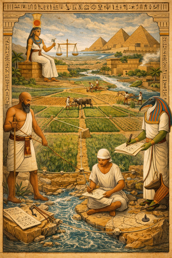 प्राचीन मिस्र में हर वर्ष नील की बाढ़ के बाद खेतों की सीमाएँ पूरी तरह मिट जाती थीं। यह पहचानना कठिन हो जाता था कि किस किसान की ज़मीन कहाँ तक थी। इसलिए बाढ़ के उतरते ही राज्य द्वारा एक संगठित प्रक्रिया शुरू होती थी, जिसमें पुराने अभिलेखों और स्मृति के आधार पर भूमि की पुनः पहचान की जाती थी।