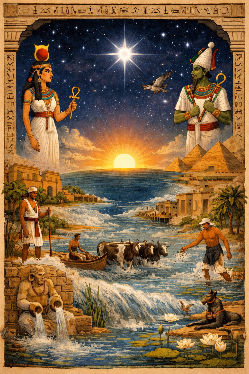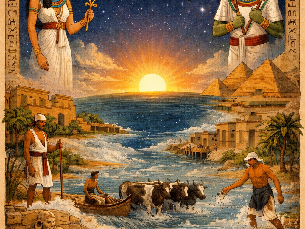 और सचमुच कुछ ही समय बाद, दूर दक्षिण में वर्षा हुई , और नील नदी का जल स्तर बढ़ने लगा। धीरे-धीरे नील का जल स्तर बाढ़ में बदल गया। यह कोई साधारण बाढ़ नहीं थी, यह जीवनदायिनी बाढ़ थी जो खेतों में उपजाऊ गाद (silt) लाती थी। इससे मिट्टी को पुनर्जीवन मिलता था और वह नई फसल की शुरुआत का संकेत देती थी।