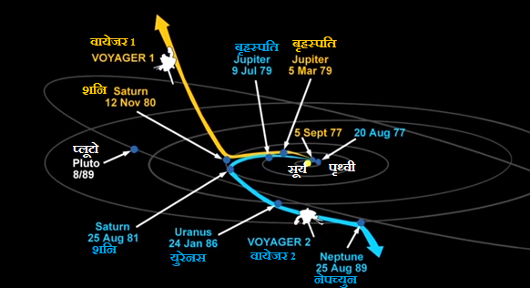 वायेजर 1 तथा 2 का पथ। दोनो का पथ इस तरह निर्धारित किया गया था कि वे ग्रहो से गुरुत्विय सहायता(Gravity Assist) लेकर आगे बढे।